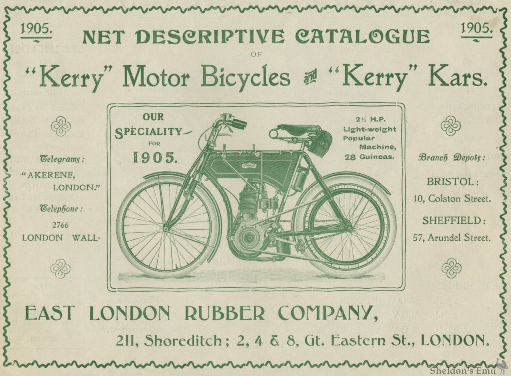1906 onwards. After the death of Alfred Kerry the parent company, East India Rubber, was acquired by Abingdon and the firm added V-twins to the range. Soon, using those engines, they were sold as the Kerry-Abingdon, and models included those fitted with a 3hp single and a 6hp V-twin. It is unclear when the ties with Sarolea were broken, if at all they were before production ceased after the outbreak of war.