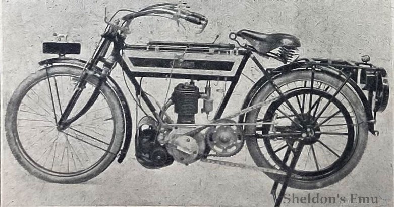 In the early days these machines were sold by the East London Rubber Co, of Shoreditch. They were built by Sarolea and fitted with Belgian CIE (Pieper) and FN engines, in a loop frame with curved downtube. As a high-built primitive, it had belt drive and braced forks. Engines were of different sizes and there was also a ladies' model.