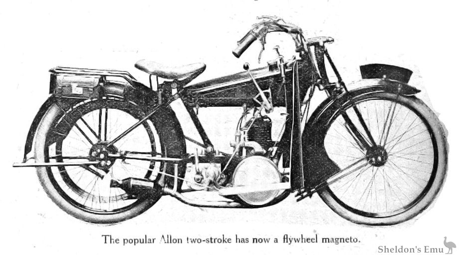 Several detail modifications are incorporated, including wider mudguards and longer wheelbase. A Villiers flywheel magneto is now fitted, thus avoiding an auxiliary chain drive which might cause noise. This ignition set may be converted to provide current for lighting at a very moderate cost. Sensible legshields are included in the specification, and an unusual feature is the fitting of the Allon special band brakes to both front and rear wheels.