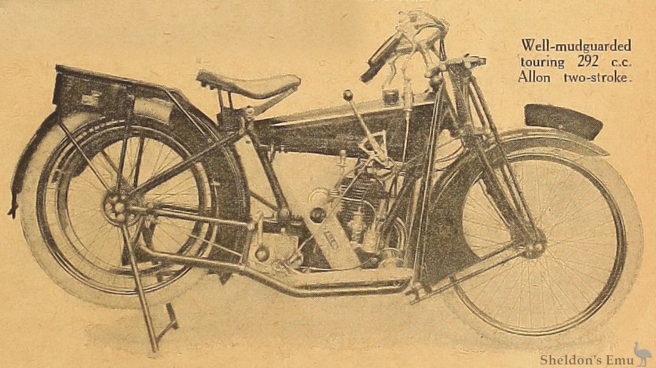 Both the 292 c.c. two-stroke and the 346 c.c. J.A.P.-engined four-stroke machines are shown, both as solo and as sidecar outfits. The two-stroke has not been altered much from the design with which the Allon made its name, and is a neat and workmanlike job, substantially built and with plenty of protection from bad weather. The touring machine, in particular, is provided with very ample mudguards.