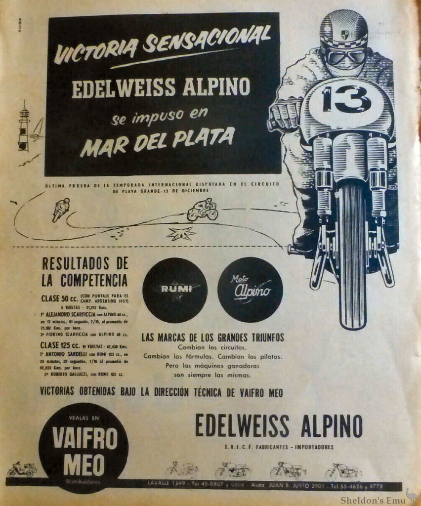 Guido Goldi, who had worked with Alfa Romeo in Italy and was a friend of Pietro Tripoldi who owned Alpino, moved to Argentina. In 1955 his Edelweiss company began importing and assembling Alpino motorcycles. To promote the marque he began entering machines in competition, with oustanding results.