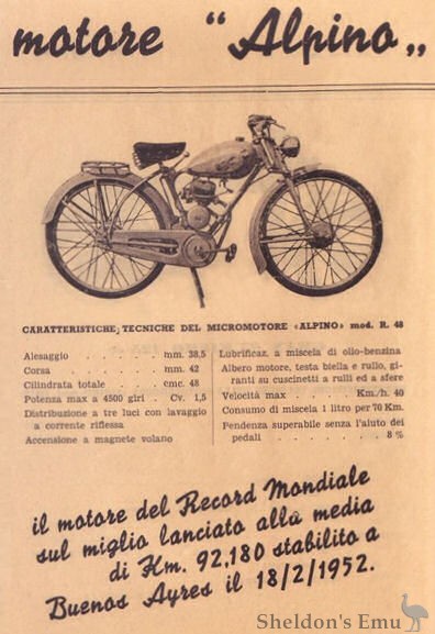 Vaifro Meo took world records on an Alpino streamliner in Buenos Aires, and in 1952 a faired prototype of the Alpino 75 ridden by Andrea Bottigelli achieved 128 km/h in the flying kilometer class, and other records were won by the Perales team in Argentina.