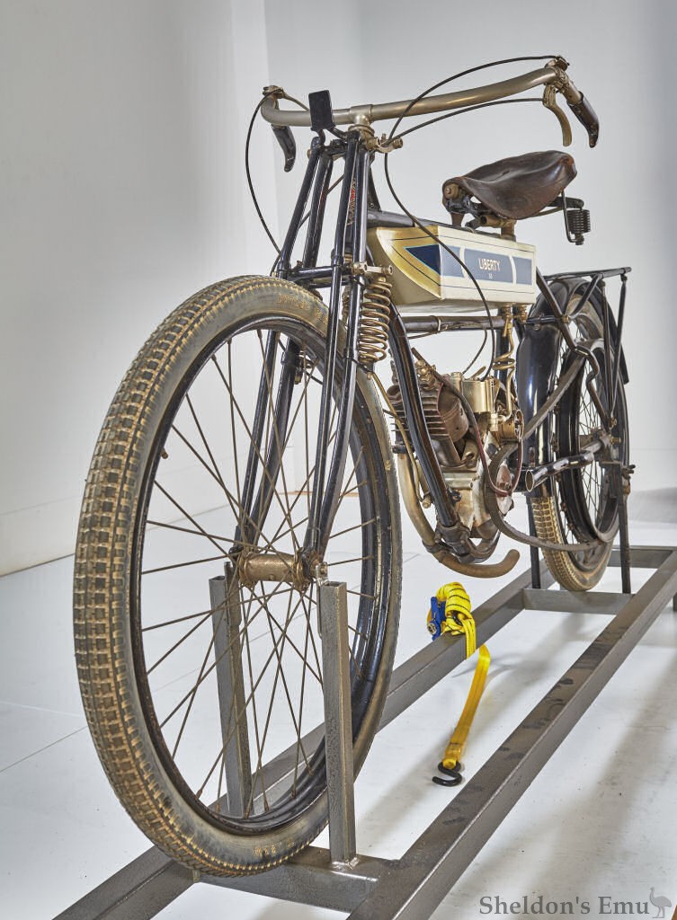To start an early motor cycle like this, the rider would use the pedals like a push bike to gather speed before engaging the clutch to kick the motor over and start it. This motor cycle is particularly significant, not only because it is of Victorian manufacture but also because it has been in the Museum's collection since new and was the first motorcycle purchased for the collection. It cost 24 Pounds when it was acquired from the Acme Motor & Engineering Company in 1916. It is believed to be the only surviving example of a Liberty motor cycle.