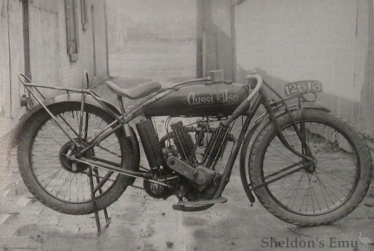 The Aussi-Also is the design of Mr. W. J. Walsh, a member of the firm. It is made in four distinct types, namely, a single cylinder two-stroke, selling at £65 complete, as against £125, the price charged for a similar imported article; a twin cylinder two-stroke, at £95 to £100, as against £180 to £190 for the imported article; a four-stroke 7 — 9 V type twin, with three speeds and the latest equipment, at £110 to £120, as against £185 to £195 imported; and a single cylinder four-stroke, at £65, as against £145 for a similar imported, article. This machine is in every sense Australian.