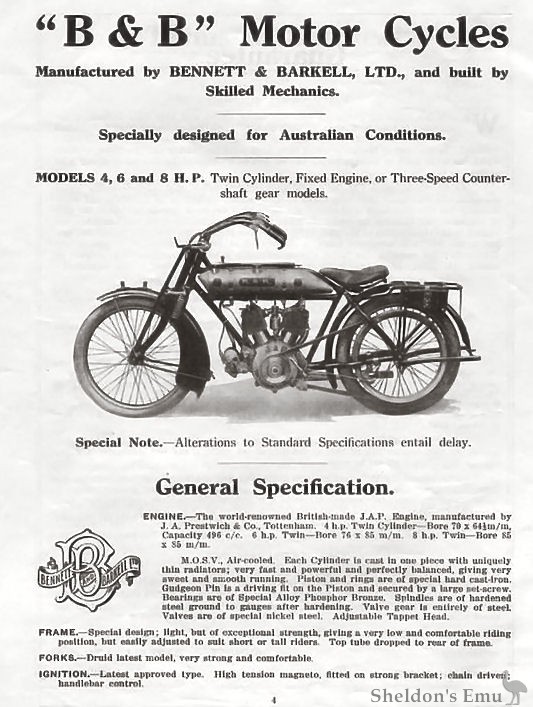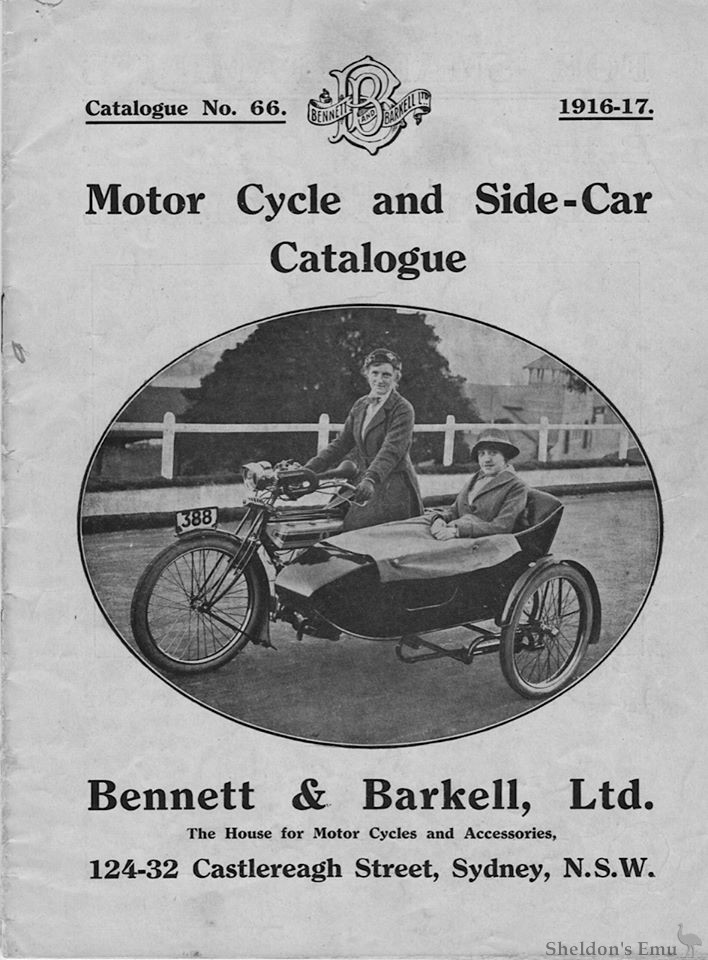 In 1914-1916 Bennett & Barkell sold both bicycles and motorcycles and every type of accessory for both. They had depots in Dubbo, Maitland, Newcastle, Tamworth, Wagga and Sydney.