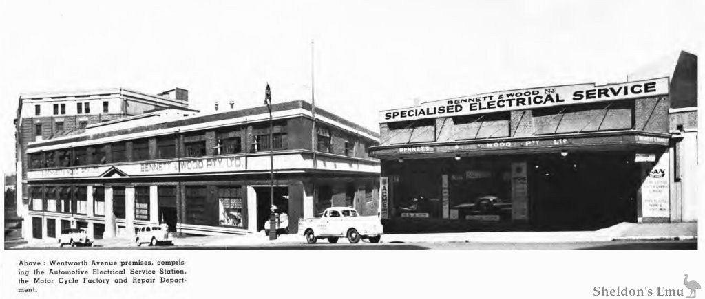 Bennett & Wood Pty. Ltd. has always provided full service facilities for the motor cycles they distribute. Over ten years ago, to more efficiently handle this work, the Company established a separate motor cycle repair and service station in the heart of the motor trade, in Wentworth Avenue, Sydney.
