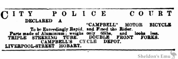 Archibald Campbell assembled motorcycles from 1902 to 1904 at 149 Liverpool Street, Hobart. These were fitted with French 1¾ h.p. L'Universel engines.