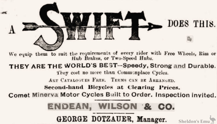 Mr C. E. Denniston, manager of the Doveton Woollen Mills, has occasion last week to make a hurried visit to Melbourne, and instead of waiting for the train obtained a 2¾ h.p. Comet Minerva motor cycle from Messrs Endean and Wilson. The down journey occupied 4½ hours, but this duration was due to an accident to a tyre, which was cut through...
