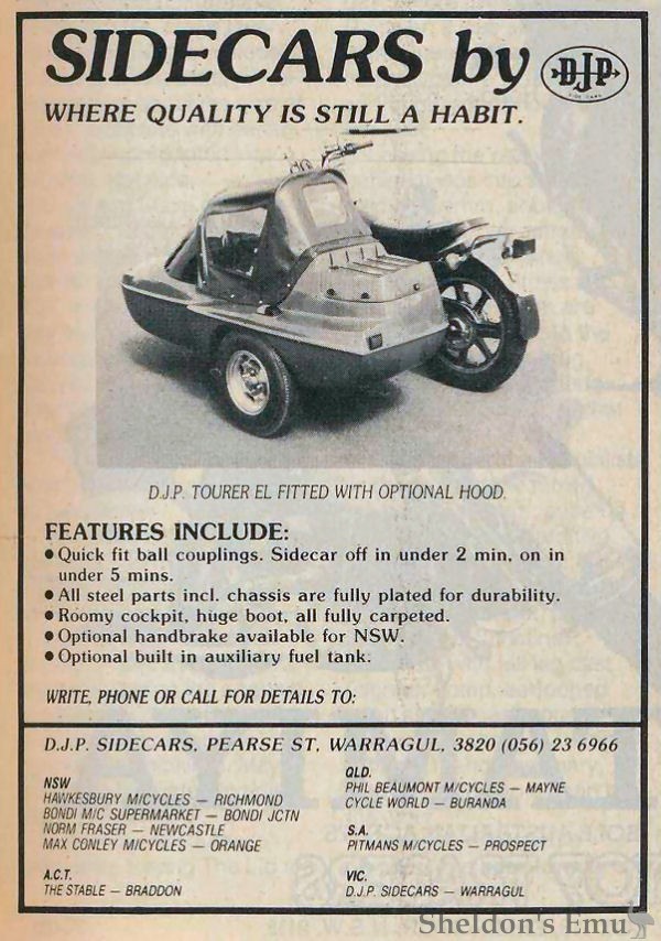 The sidecars were of high quality and enjoyed a very good reputation both for the finish and the strength and durability of the chassis, well suited to the harsh conditions found on Australian roads in many areas. It was also popular in Japan. Later models were available with fibreglass bodies.