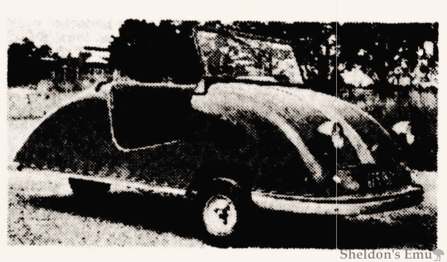 The makers, Gray and Harper Pty, Ltd., North Rd., say it could be marketed at £350 tax paid, and be a satisfactory runabout for up to three people at motor-cycle cost. Annual output would be about 70 cars built to order.