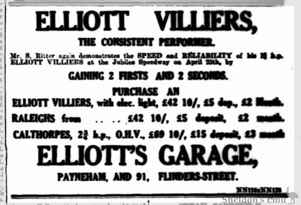 In 1917 the Elliott Bros. exhibited bicycles and motorcycles at the Adelaide Royal Show to considerable acclaim, with the result that many country dealers began to sell their products, including Elliott-Villiers two-strokes.