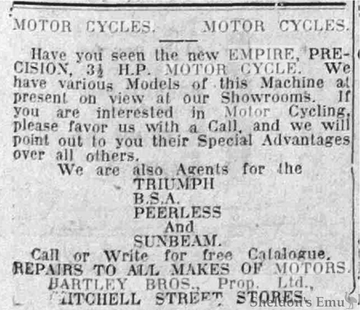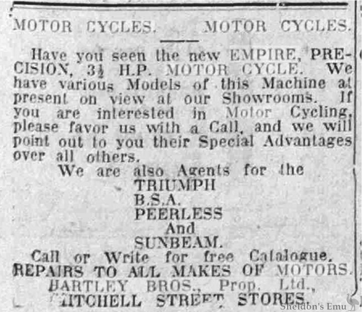 Have you seen the new EMPIRE PRECISION, 3½ H.P. MOTOR CYCLE. We have various Models of this Machine at present on view at our Showrooms. If you are interested in Motor Cycling, please favor us with a Call, and we will point out to you their Special Advantages over all others.