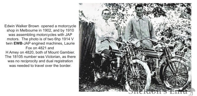 "Mr. R. Dowell, the local representative of Mr. E. W. Brown, of Melbourne, is exhibiting single and twin cylinders E.W.B. motor cycles, and also Rudge, Humber and King Dick motor cycles." Oct 1913