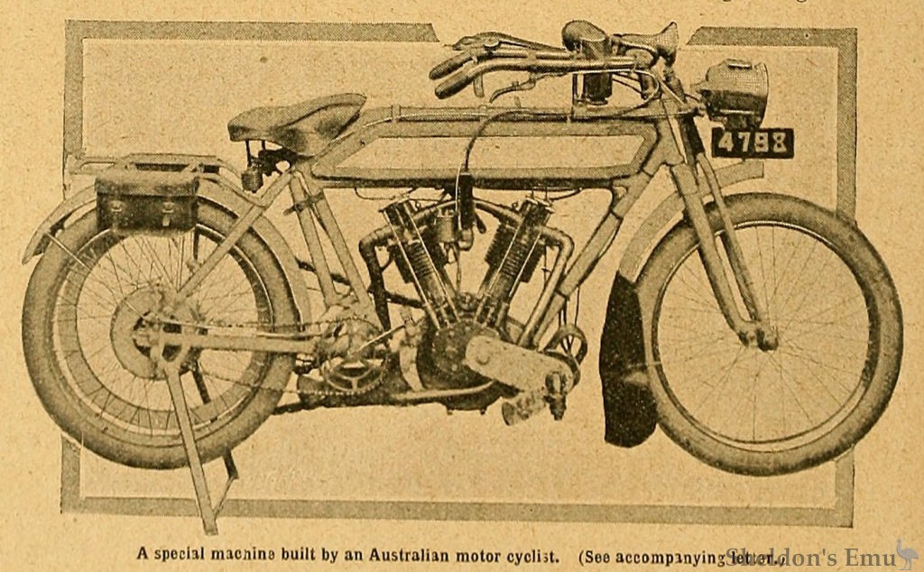 Sir, I have been a constant reader of The Motor Cycle for many years, and have always thoroughly enjoyed it. Thinking you would be interestea. I enclose a photo- graph of my new free engine two-speed gear motor cycle, which I have recently completed. In reference to the engine, the cylinders are 3in. bore by 3 ½in. stroke. The radiators are machined out of the solid; the body of cylinders below the radiators is machined and polished. The combustion space is larger than the bore of the cylinder; this allows of large diameter valves. The cylinder heads are detachable, and are secured to the eylinders with six studs. The undersides of the valve heads have 3/16 in. diameter pins projecting.