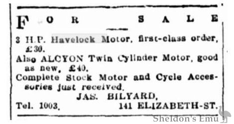 In 1915 Bilyard was listed as a Triumph agent, and later he partnered with James D. King (aka Sim King) of Launceston to import Triumph and BSA, and the firm became Bilyard and King with stores in both cities. They produced motorcycles name "Bilyard & King" around 1924.