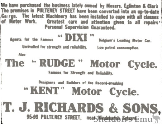 'Eglinton & Clarke' commenced in Pultney Street, photos of which were often seen in motoring publications. They became agents for Rudge motorcycles, and by now were adapting the Kent valve to Rudge, JAP, and others. They worked well. Often all category winners in competitions were Kent equipped.