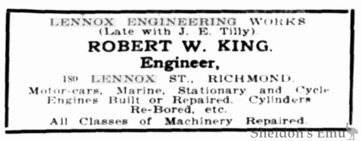 Mr. Robert W. King, son of Mr Herbert King, has commenced in business as motor and mechanical engineer at 180 Lennox-street, where a special engineering shop has been erected. Mr. R. King, on completing his indentures with a leading city firm, was highly eulogised, and he has proved his abilities on important works. Patrons of the new works are assured that their wants will be thoroughly satisfied. Special attention will be devoted to the reboring of cylinders and the fitting of pistons.