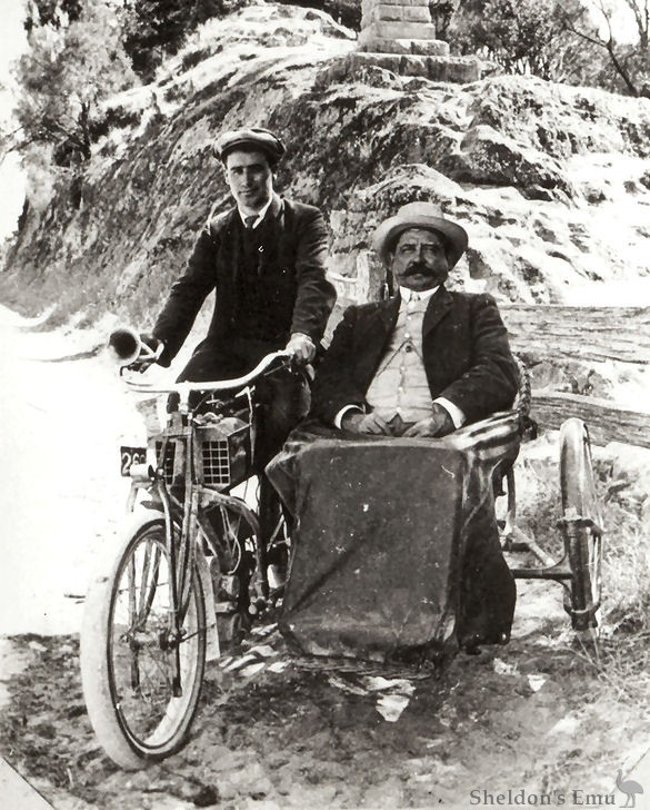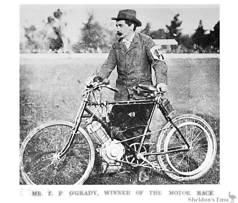 Tom O'Grady was works manager of the South Australian manufacturer, Lewis, who built a range of water-cooled motor bicycles in the veteran period. In 1902, O'Grady built this fine special with a large Excelsior engine very like the first machine John Osborn built which started his career in transport, and the Osborn Engineering Company he founded during WW1.[3]