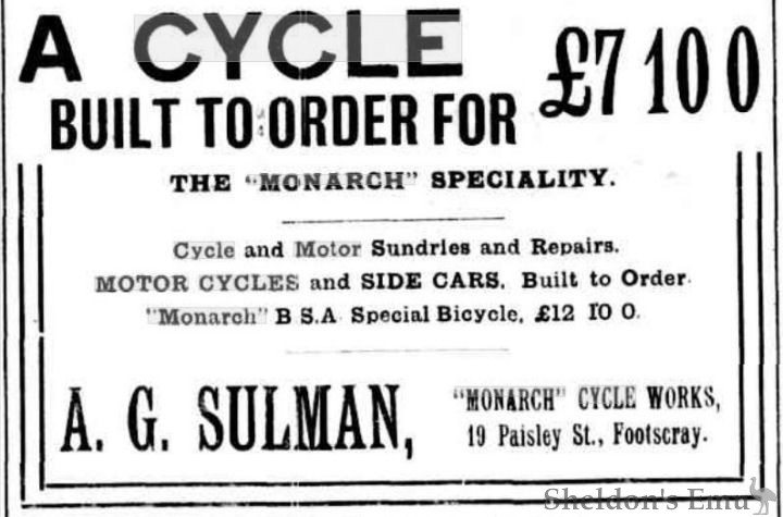 Manufactured by the brothers Albert and Robert Sulman at 11 Buckley Street, Footscray, Victoria, in 1914. Robert left the business which then moved and became A. G. Sulman, Monarch Cycle Works, 19 Paisley St,, Footscray in 1917.