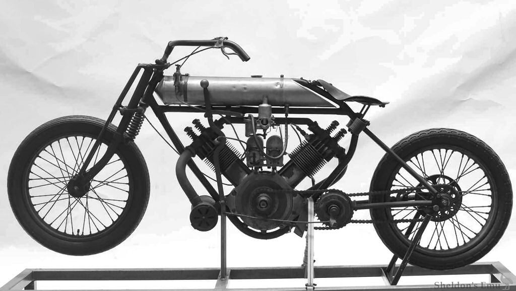 John Oliver of Planet Cycle Works in High Street Kew, Melbourne, had produced conventional motorcycles under the Planet and Planet Aero marques. His son Monty related that John had arrived home a little the worse for wear after a session at the local, then sat and drew up the plans for this behemoth on a piece of brown paper - reminiscent of another Australian story, the sketch of the Vincent V-twin on the back of a beer coaster (of which Phil Irving gives a rather different account). Construction took place between 1913 and 1915, and when The Planet became a reality it could reputedly achieve the very respectable speed of 85 m.p.h - but just where he found roads suitable for such extraordinary speeds is a mystery, bearing in mind that the recently set record for a run from Sydney to Melbourne averaged 18mph along the Hume Highway - a narrow dirt road lined with gum trees and rutted by carts and carriages. In the sixties and early seventies parts of the old dirt highway were still plainly visible running parallel to the two-lane concrete-coated road.