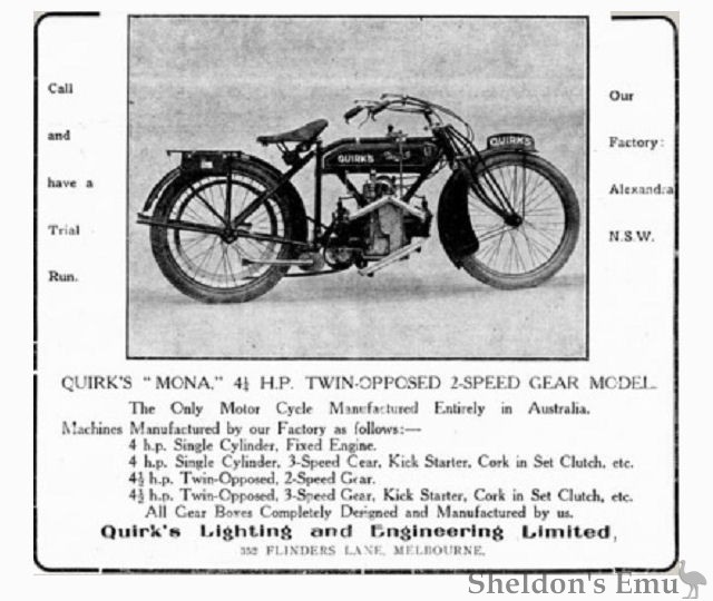 Quirk's Mona was built during the early years of WWI. Everything including the 4½ h.p. 496cc sidevalve flat-twin engine was built in-house, with the exception of the Druid-style "Peerless" forks which were sourced from Healing & Co in Melbourne. A 2-speed clutchless countershaft gear was fitted standard, with a 3-speed gearbox and kickstart as an option.
