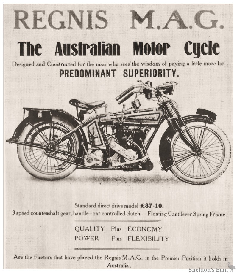 Numerous models were built for Regnis from 1912 to 1920, most of them by A. G. Healing. These included the Peerless fitted with JAP, MAG, King Dick, Precision and De Luxe engines, all of which were sold under the Regnis brand.