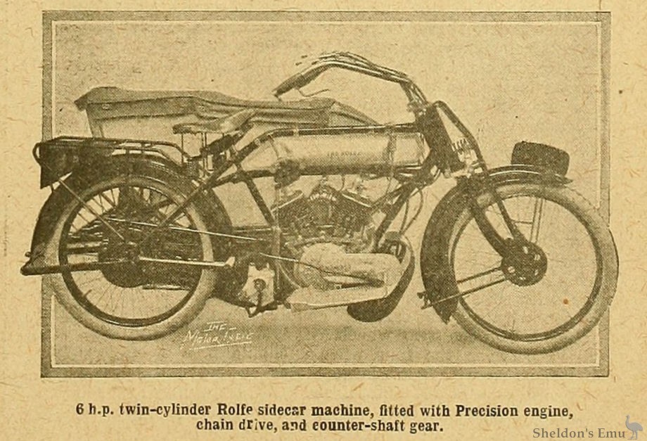An advertisement stated "Rolfe Motors are your best investment in Motors - like the Cycles are Sure, Safe, Speedy, and Guaranteed".