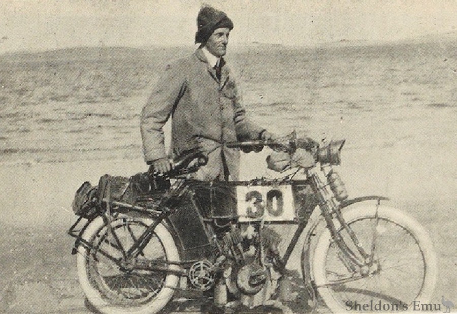 In light motor cycles the firm are showing a splendid motor cycle, built to the order of Mr. Charles Gilmour, of Somerset. This is a handsome and handy motor cycle, fitted with a 2¼ h.p. twin cylinder Moto-Reve engine, with magneto ignition, and is a marvellous climber, and capable of doing 25 miles per hour on Tasmanian roads. This motor cycle has been inspected and admired by motorists from near and far, and many have unhesitatingly stated that in light motors it has supplied a long-felt want, and should find rapid sale. In "Sovereign" bicycles the firm have a display for variety and quality that can not be surpassed...