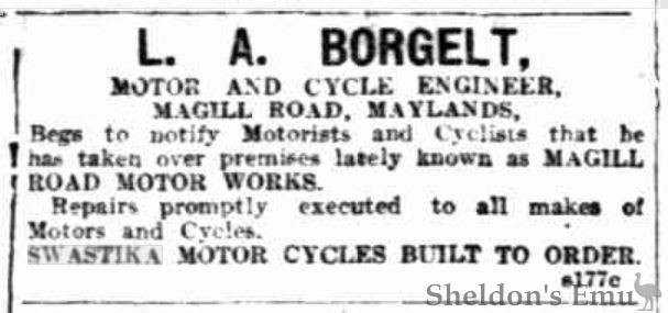 In 1915 he opened a business in Maylands. He first entered competitions in 1920 and won various trials, hill climbs, and races at Sellick's Beach. In 1922. he toured England and the Continent, returning by way of America in 1923. Mr. Borgelt was one of the first riders to compete on the Gawler racecourse track when it was used for motor cycle races.