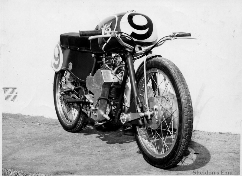 Rex Tilbrook designed a brand new engine for the purpose of winning the 1953 Bathurst race, a rotary-valve 125cc. It was, however, not a success and he returned to to a conventional two-stroke engine, achieving a 4th place in the 125 TT. The original twostroke 125 was taken to Phillip Island for the International GP in 1989 but was withdrawn before the race.