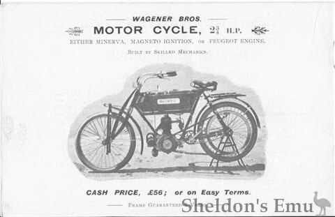 Manufactured by Wagener Bros, 149 Rundle St, Adelaide from 1906 using Minerva and Peugeot engines. One of the brothers, Ted, left the firm to form his own business building motorcycles named Blue Spec .