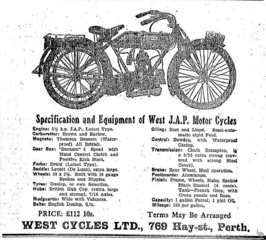 A wonderful machine is the locally-built J.A.P.-engined West motor cycle, samples of which can be inspected at 769 Hay-street. The builders challenge comparison with other machines, and defy financial considerations.