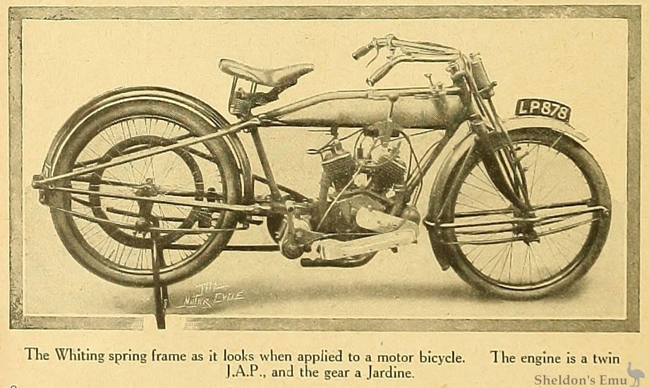 It was clearly a success, and was favourably received by the few people whom the inventor and his colleague. Mr. Herbert Credgington, approached This gave Mr. Whiting sufficient encouragement to build up a new and improved model, which we recently had the opportunity of inspecting. In his design, Mr. Whiting has adopted semi-elliptical leaf springs, wisely following automobile practice, and at the same time bearing in mind that this particular type of spring is smooth in action, almost devoid of rebound, and unlikely to break or give trouble. Not only in the springing, but also in the design of the frame itself, has a considerable amount of ingenuity been displayed. The frame gives a low riding position, is immensely strong, and is at the same time by no means heavy. The back forks are produced forward in a continuous line, so that they take the place of the secondary tube and terminate in a point at the base of the steering head. These two tubes are stayed by a substantial strut, and thus a triangle is formed giving great strength. The bottom bracket casting is specially designed to take the Jardine four-speed gear box, which is attached by means of bolts running through oval holes, thus providing means of adjusting the transmission chain. Alignment is preserved by the provision of a groove, along which the gear box slides.