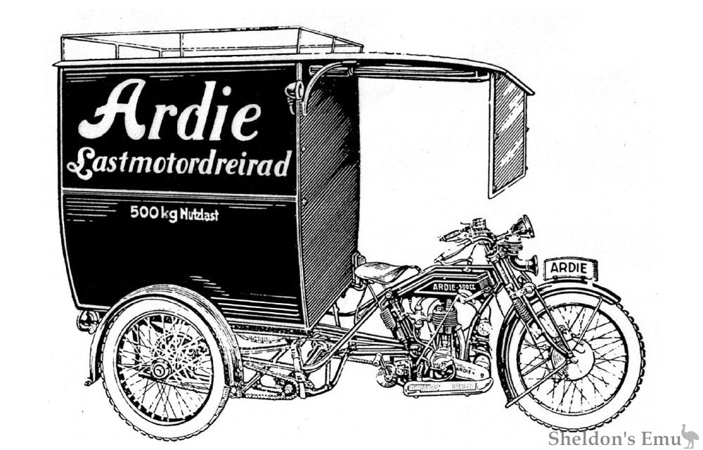 In 1926 Ardie presented a three-wheel rear-loader powered by an Ardie air-cooled 490 cc single-cylinder four-stroke or alternatively with a JAP engine. A lighter version had an air-cooled 5 hp single cylinder 349cc two-stroke engine with 349 cc displacement. The maximum load capacity of the Transport-Dreiräder was 500 kg.