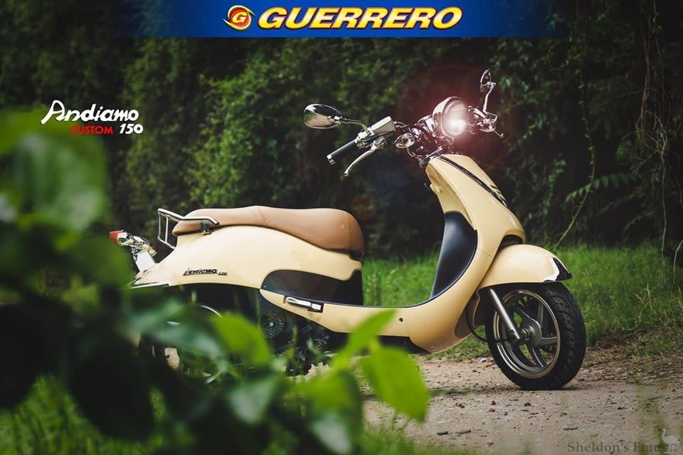 Guerrero models include Motocarga 200 (motocarro), along with minibikes, mopeds, 110cc lightweights, scooters, sports roadsters and a variety of trail and mx machines.