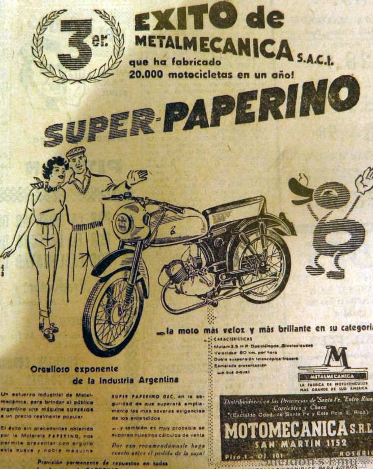Established in 1957, the firm built motorcycles under licence from Gilera Italy. A new factory was built in 1962, and in 1963 employed 600 staff. They had a test track, and a foundry in Spegazzini where much of the casting was done.
