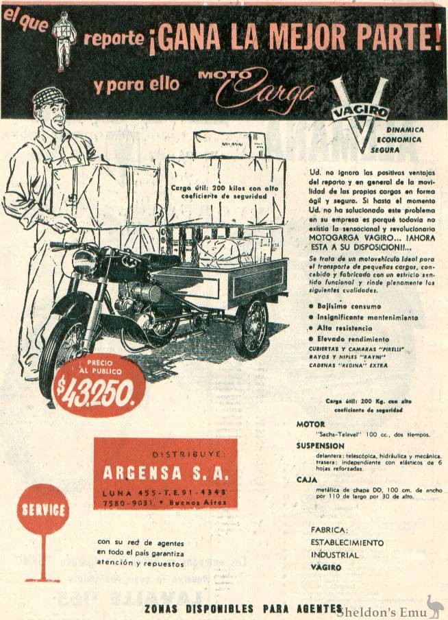 Manufactured in Buenos Aires by Vagiro SRL in the late 1950s or early 60s. These were motocargo tricycles powered by 100cc Sachs-Televel engines and were distributed by Argensa S.A. It seems likely that most of the components were sourced from Puma, and that very few were built.