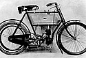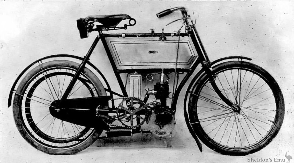The above is the latest type of motor bicycle introduced by The Ariel Motor Co., Ltd. The whole machine, including the engine of 2¼ h.p., has been designed and manufactured at their factory in Birmingham. The carburetter, of the surface type, is the same design as used with great success on Ariel tricycles and quads, with a running capacity of 110 to 120 miles. The lubricating pump with glass barrel and oil compartment is let into the frame tank, the accumulators being carried in a separate case under frame tank. Ignition is by make and break on the timing shaft, a trembler being fitted on the induction coil. One lever controls the speed; this lever also opens the exhaust valve when placed in a vertical position. A useful refinement is the addition of a prolector over the chain and free-wheel clutch.