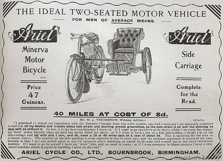 The Ariel 2¼ h.p. model will be on similar lines, but fitted with a surface carburetter, as this type has been found the most suitable for an engine of this power. Ariel-Minerva models are marvellous value, and the 2 h.p. Ariel-Minerva at thirty-five guineas will be very hard to beat; 2¾ and 3½ h.p. Ariel-Minervas will be offered at forty and forty- five guineas respectively, inclusive of Minerva- Longuemare spray carburetter. A very interesting link with the past will be found on. this stand in the shape of an Ariel motor tricycle and quad, in which class of machine the Ariel Company held practically a monopoly a few seasons ago; they are still open to supply in limited quantities. This firm will also show one of their new patent attachments for coupling an ordinary bicycle to a motor bicycle, which has been perfected in every way and fully protected.
