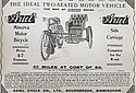 Motor bicycles will form the chief exhibit of the pioneer manufacturers of all-British motor cycles. Ten motor bicycles will be shown, with a variety of Ariel sidecarriages and forecarriages, prices varying from thirty-five guineas upwards. One of the special features of this exhibit will be the new 3½ h.p. Ariel engine, with the now popular mechanically operated valves. This model has been specially designed for use in conjunction with sidecarriage or forecarriage. The engine is up to the usual well-known Ariel standard, and bristles with good points, a few being: Extra large phosphor bronze bearings; fly-wheels of equal weight; new designed contact breaker with transparent celluloid face; two to one gear, rotated by a worm drive, entirely detachable i without disturbing the crank case. The 3½ h.p. Ariel motor bicycle will be fitted with Ariel duplex front forks, Longuemare spray carburetter, two accumulators with two-way switch, exhaust valve-lifter, and combined cut-out to operate from the handle-bar.