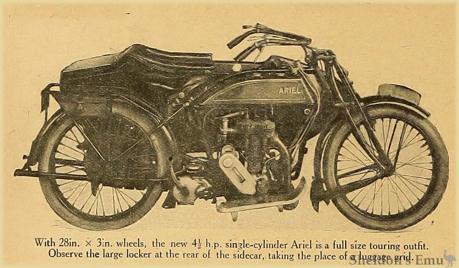 With 28in. x 3in. wheels, the new 4½ h.p. single-cylinder Ariel is a full size touring outfit. Observe the large locker at the rear of the sidecar, taking the place of a luggage grid.