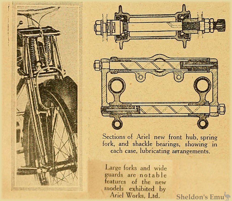 Sections of Ariel new front hub, spring fork, and shackle bearings, showing in each case, lubricating arrangements.
