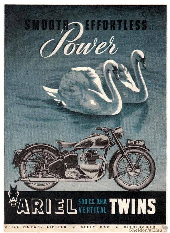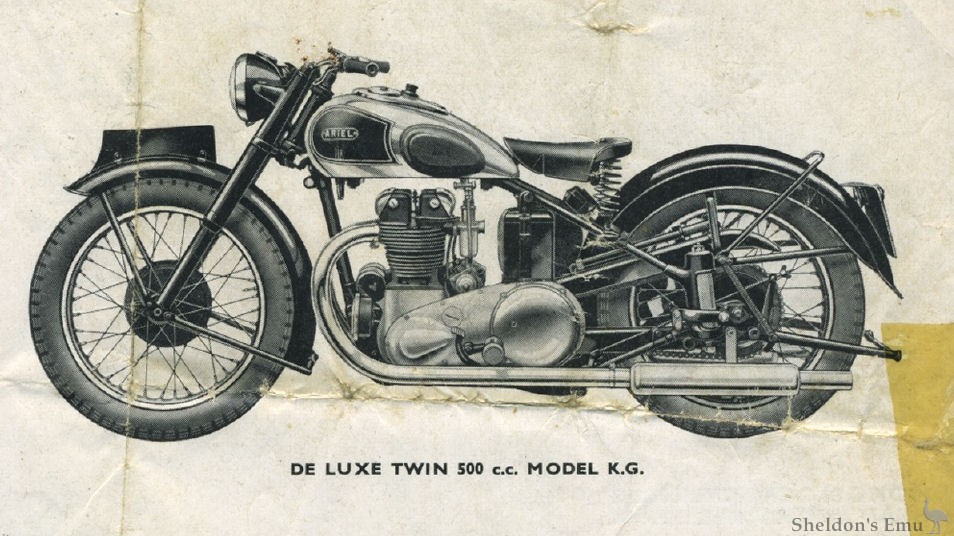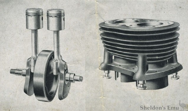 ENGINE. 63 x 80 mm. Vertical O.H.V. Cylinder heads and rocker boxes in one casting. Balanced crankshaft forged in one piece, carried on a large roller bearing on drive side and plain white metal bearing on timing side. Light alloy connecting rods with replaceable white metal liners. Forged light alloy pistons 6.8 compression ratio. Twin camshafts driven by automatically adjusted duplex chain. Separate magneto with automatic ignition control. Gear-driven 36 watt dynamo.