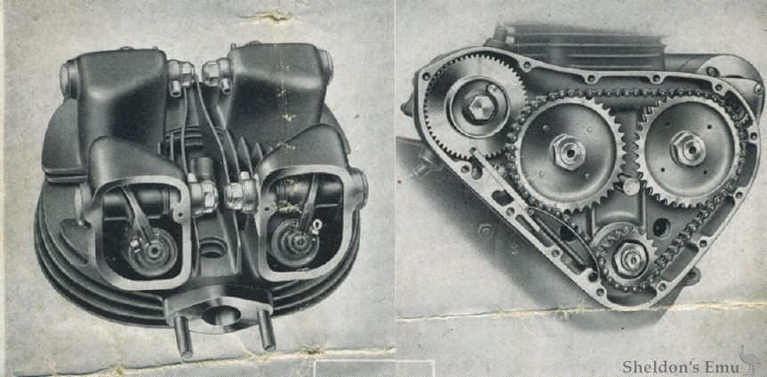 TWIN CAMSHAFTS driven by automatically adjusted duplex roller chain: gear driven magneto with automatic ignition control: gear driven 36 watt dynamo.