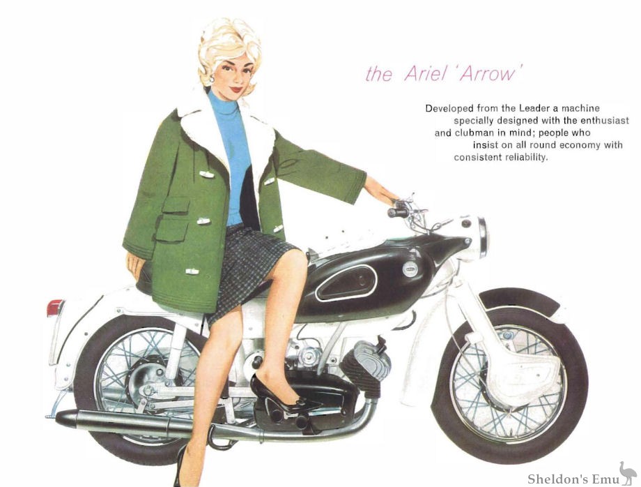 The Arrow was developed from the Ariel Leader with which it shared the 249cc two-stroke engine and monocoque chassis but not the enclosed bodywork, giving it a more desireable image and also a lower retail price. First revealed in 1959 and promoted as a sports version of the Leader, the Arrow was followed in 1963 by the 250cc Golden Arrow.