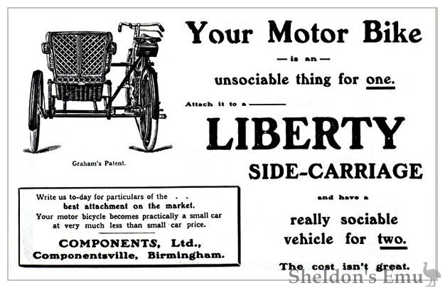ALTHOUGH not exactly a slogan, these four lines of doggerel answered very well in 1903 as a battle cry - or trade cry, to be more accurate. They were published together with an illustration of the first sidecar ever advertised in The Motor Cycle. That was early in 1903, and the enterprising firm was Components, Ltd., Birmingham, the makers of the present-day Ariel. This company was astute enough to recognize that the sidecar would eventually oust the trailer and "quad," and advertised their production as the "Liberty" Sociable attachment, an appellation emphasizing its companionableness more than the bare word sidecar would have done.