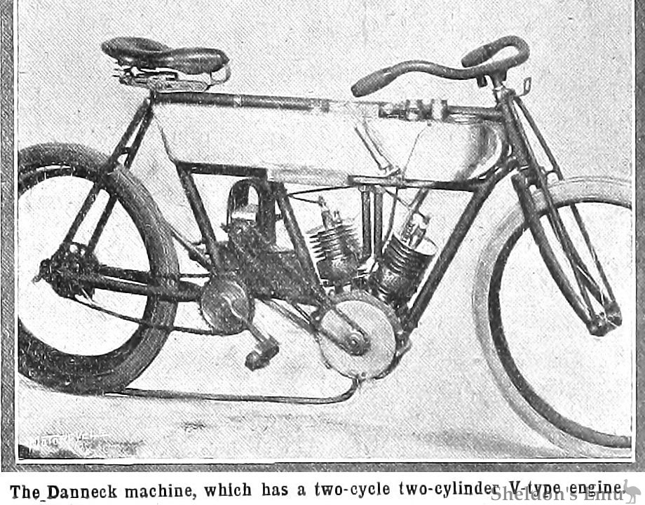The Danneck machine has a twin-cylinder two-stroke engine. It is believed to be of Austrian origin, but little information on the marque is available.