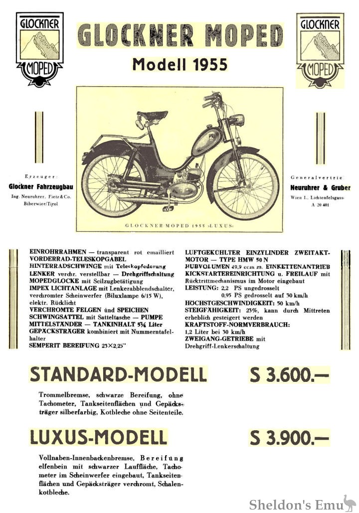 The Glockner firm built rather attractive mopeds powered by 50cc HMW two-strokes from 1951 to 1958, and possibly also used Puch engines.