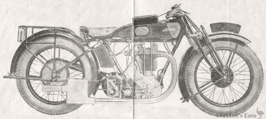 Engine: JAP OHV; bore 85.7mm, stroke 85mm; volume 500ccm; power 5 CV; 1 exhaust; special aluminum piston; detachable cylinder head; rich ribbing for good cooling