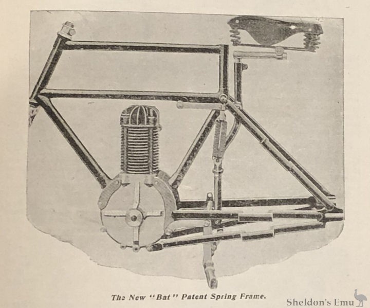 Bat Motor Manufacturing Co. of Penge, S.E. The Bat motor-bicycle has only been on the market for a few months, but it has already made an excellent name for itself, for two reasons. The first is that the machine is designed from first to last with the one idea of making a thoroughly reliable, strong, and powerful motor-bicycle, and the second reason is that the machine has developed a wonderful turn of speed, and this is solely due to the complete harmony of the system. The machine has a close, compact frame, firmly stayed for the work. In the No. 1 pattern a 2¾ h.p. De Dion air-cooled motor is employed, and in the No. 2 the power is 2½. The motor is placed vertically in the frame, and a stay runs from the bottom of the motor casing to the rear axle. The power is transmitted through the Bat patent pulley, and a Chicago raw hide belt to the rear wheel. The belt fastener is extremely neat and effective, and the patent switch, operated from the Bowden brake lever, renders the breaking of the current instantaneous. At an extra charge the new patent spring frame can be given, whereby the rider is carried on an insulated portion, and all vibration is avoided by an excellent method. A spray carburetter is used, and a petrol tank of the capacity of gallons is provided. The machine has neither pedals nor chain gearing, because the rider's power is dispensed with at starting and on the road, as the machine will climb any hill. F. W. Chase has recently done some marvellous performances on the Bat, proving almost without a doubt that it is on of the fastest motor-bicycles (of a reasonable horsepower) in the world. We illustrate the spring frame, and on another page will be found a photo of a group taken on a recent historic occasion.